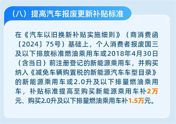 所以,国家再次加码,也就是这次7月25日的新政(《关于加力支持大规模设备更新和消费品以旧换新的若干措施》),所有的操作都没变,就是 1 万的新能源补贴变成了 2 万,换燃油车的 7000元补贴也加码到 1.5 万元。