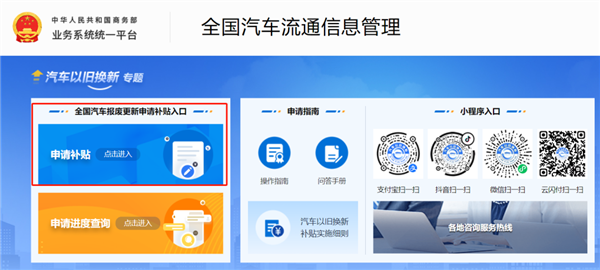 具体的领取也很简单,拿着今年12月31日前出具的报废机动车回收证明、机动车注销证明等相关材料,在2025年1月10日之前,去全国汽车流通信息管理系统网站或者是汽车以旧换新小程序上申报(这系统还挺简单快捷的),就可以等着国家给你发钱了。