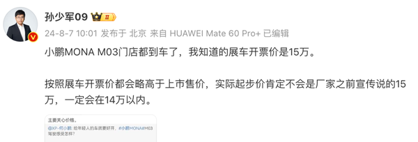 而就在官宣预订的同一时间,据@孙少军爆料,小鹏MONA M03门店展车开票价是15万元,按照展车开票价都会略高于上市售价,实际起步价肯定不会是厂家之前宣传说的15万,一定会在14万以内。