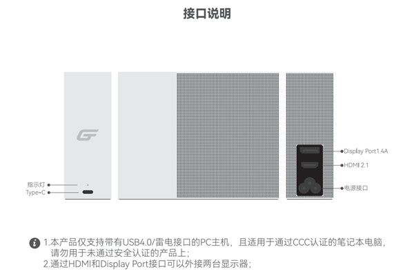 Hi GT Cube使用手册显示,该产品支持带有USB 4.0/雷电接口的PC主机,且适用于通过CCC认证的笔记本。