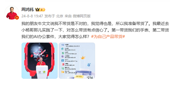周鸿祎还透露,带货的第一件商品是360手表,第二件是AI办公套件。