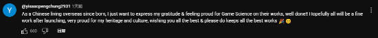 我是在海外出生的华人,我只想表达对游戏科学的感激和自豪,做得好!我为我的传统文化感到自豪,祝你们一切顺利,请继续保持最好的作品质量。