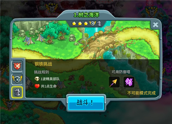 游戏一共 16 个关卡,在通关普通模式后,还可以选择英雄模式和钢铁模式重新挑战。这两个模式都只有 1 滴血,漏掉一个小兵就会挑战失败,钢铁模式还会限制你的防御塔类型。