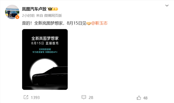 8月12日消息,岚图汽车科技有限公司CEO卢放今日上午通过微博宣布,全新岚图梦想家将于8月15日进行直播首秀,成为全球首款集成华为乾崑智驾和鸿蒙座舱的MPV车型。