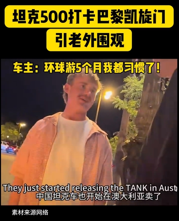 视频中,他们将这辆坦克500 Hi4-T开到了巴黎凯旋门,引发众多老外拍照、围观。