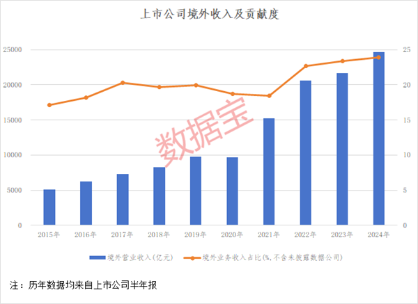 据数据宝统计,2049家公司2024年上半年实现境外收入2.46万亿元,创历史新高,较10年前增加近4倍。
