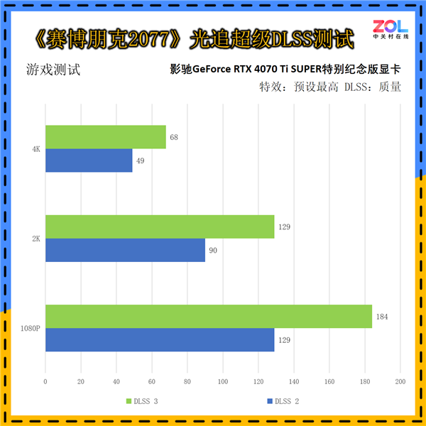在DLSS3的测试中,首先来看《赛博朋克2077》的,我们同样会将DLSS3与DLSS2的结果进行比对。