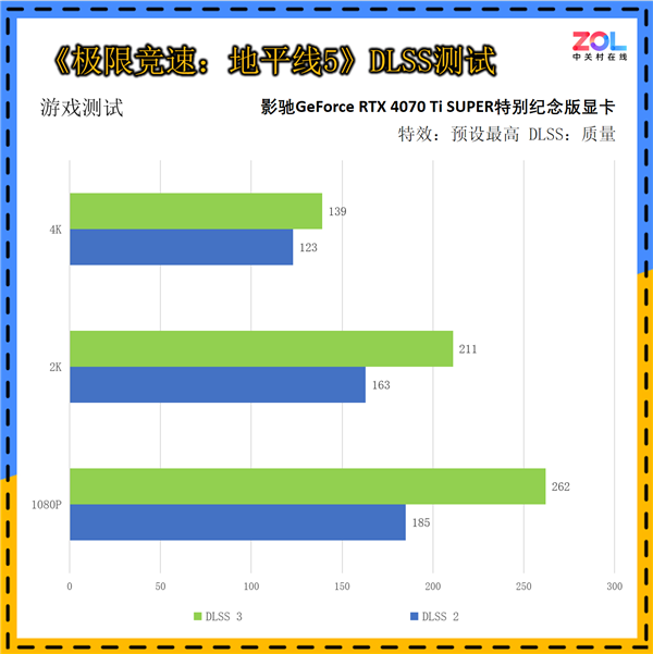 《极限竞速:地平线5》也是显卡测试的老朋友了,其出色的优化让很多入门级产品都能跑出较高的帧率。在影驰GeForce RTX 4070 Ti SUPER特别纪念版显卡也有较明显地体现。在3种分辨率中,开启DLSS3相比DLSS2的提升分别为42%/30%/7%。