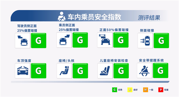 在车内乘员安全分指数方面,小米SU7无论是主驾驶、副驾驶侧正面25%偏置碰撞,还是正面50%偏置碰撞,亦或是侧面碰撞等多个项目均取得了G(GOOD)的好成绩,最终整体获得G+的评定,也就是最高级。