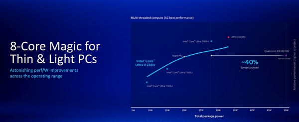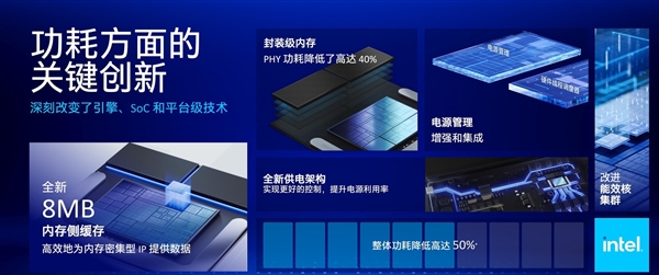 从英特尔官方公布的信息来看,Lunar Lake在每瓦性能的提升上着实是下了很大功夫,这使得新平台总体功耗下降了50%。