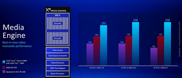图形性能和能效升级的同时,Xe2GPU也为Lunar Lake带来了全新的媒体和显示引擎。其中,媒体引擎在原有的AV1编解码上增加了VVC解码支持,而显示引擎支持eDP 1.5、DP 2.1、HDMI 2.1接口标准。新的媒体与显示引擎可以更好地支持自适应分辨率流媒体和360全景视频。