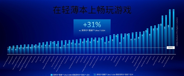 游戏性能方面,新一代锐炫核显的游戏性能最受期待。根据英特尔官方数据来看,全新的锐炫140V核显对比上一代酷睿Ultra 7 155H集成的锐炫核显,游戏帧数平均提升31%;相比骁龙X1E-84-100处理器,除了23款骁龙平台无法兼容运行的游戏之外,正常完成测试的游戏中,平均帧数高出竞品68%。另外相对于图形性能显著提升的锐龙AI 300系列的HX 370处理器集成的Radeon 890M来说,锐炫140V游戏平均帧数高出16%。