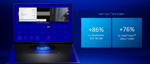 实际应用方面,英特尔也给出了一系列测试数据,其中包括AI降噪、BlenderOIDN+RT、Topaz、Lightroom、Premiere、AE等各项AI相关测试中,均大幅领先上一代酷睿Ultra 7 155H以及骁龙X1E-78-100平台。