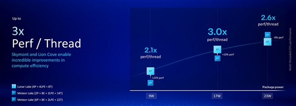 而在多线程能效比方面,Lunar Lake也有着相当出色的表现。对比上一代Meteor Lake,Lunar Lake在9W功耗上的8线程性能,比Meteor Lake 14线程性能高22%,每线程性能高2.1倍;在17W功耗上,Lunar Lake 8线程性能比Meteor Lake 22线程性能高10%,每线程性能高出3倍;在23W功耗上,Lunar Lake 8线程性能仅比Meteor Lake 22线程性能低6%,每线程性能高出2.6倍,足见其CPU能效比相对上一代而言提升巨大。
