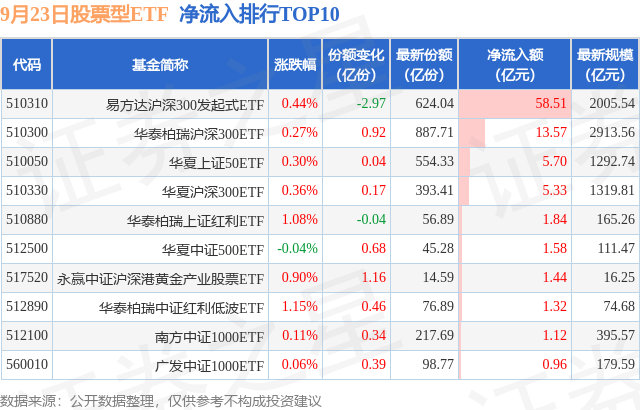 当日有313只股票型ETF基金出现资金净流入,其中净流入排首位的是易方达沪深300发起式ETF,份额增加了-2.97亿份,净流入额为58.51亿元。