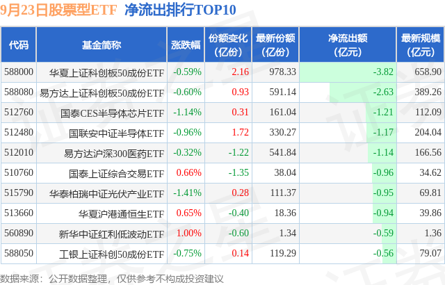 当日有304只股票型ETF基金出现资金净流出,其中净流出排首位的是华夏上证科创板50成份ETF,份额减少了2.16亿份,净流出额为3.82亿元。