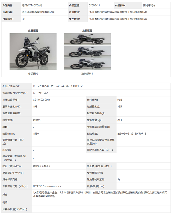 此外,从工信部申报信息来看,春风动力 800MT-X 摩托共有两个版本车型(普通版/三箱版),可选择不同高低挡泥板。