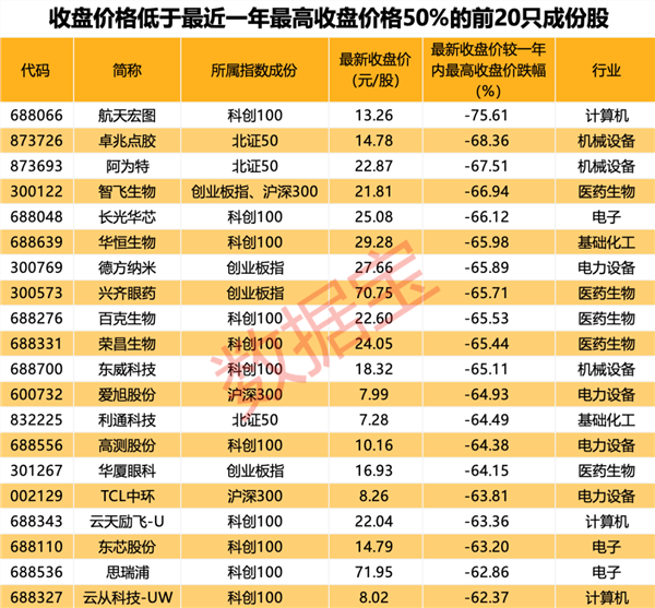 航天宏图的最新收盘价格较最近一年最高收盘价的差距最大。该股是科创100指数成份股,最新收盘价为13.26元/股,较最近一年内最高收盘价54.36元/股跌去75.61%。公司上半年归母净利亏损1.85亿元,同比由盈转亏。此外,今年年初公司核心技术人员的离职,因违规被暂停采购以及多名高管相继辞职等多重负面因素也使股价持续下跌,早已跌破了发行价格。