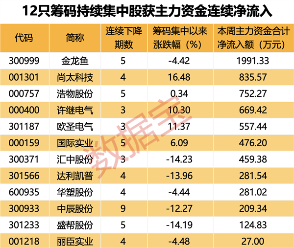 本周以来,12只筹码连续集中股连续两日获得主力资金净流入,其中金龙鱼主力资金净流入金额最多,两日合计净流入1991.33万元。还有尚太科技、浩物股份、许继电气、欧圣电气的合计净流入额居前。