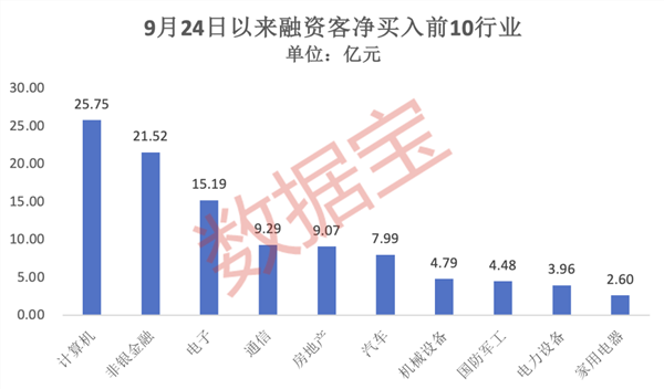 从行业来看,自9月24日以来,17个申万一级行业获融资净买入,计算机、非银金融、电子行业居前3,融资净买入额均超过15亿元。其中,计算机行业接近26亿元;通信、房地产、汽车行业获融资净买入超5亿元。