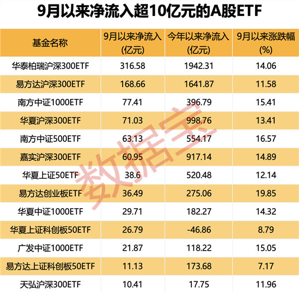 自7月份以来,A股ETF连续3个月净流入额超千亿元。9月以来,13只ETF净流入金额超10亿元,净流入超30亿元的易方达创业板ETF涨幅位居13家公司之首,接近20%;其次的南方中证500ETF涨幅超过16%。