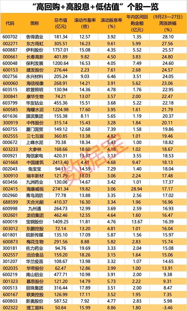 低估值、高分红,叠加业绩稳定,或成为本轮大反弹的急先锋,比如舍得酒业、东方雨虹、伊利股份、长春高新上周涨幅均超20%。