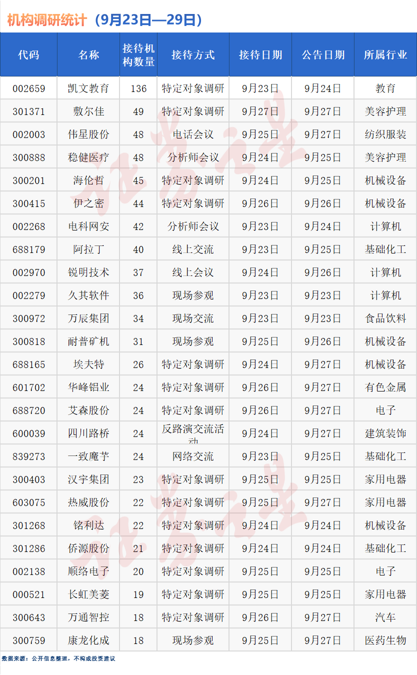 具体来看,凯文教育上周最受关注,于9月23日24日接待国投证券、东方基金、东吴证券、东兴基金等136家机构调研,其中不乏中庚基金、红杉资本、华夏基金等多家明星机构。除当日外,凯文教育近一年共接待64家机构65次调研。