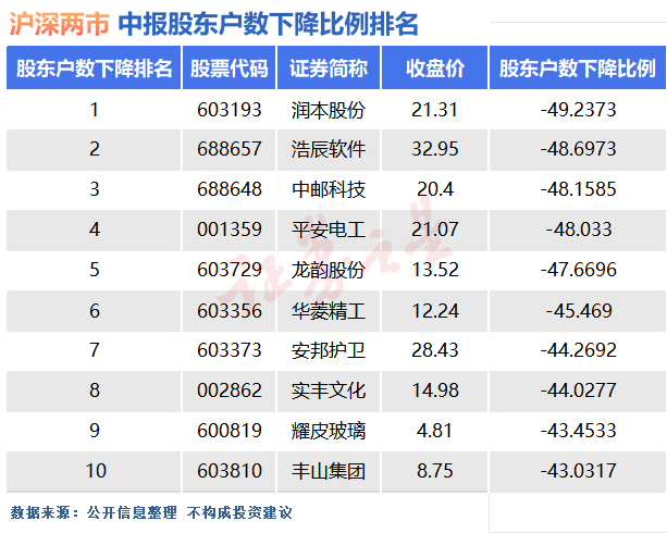除了股东户数减少数量靠前的公司外,股东户数减少比例靠前的公司同样值得关注,在剔除被ST或退市的个股后,润本股份以接近50%的股东下降比例位列首位,此外浩辰软件、中邮科技、平安电工位列2、3、4位,股东户数下降比例均超过48%。下表是沪深两市中报股东户数下降比例排名的详细情况。