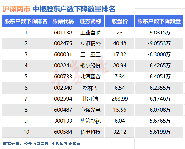 从中报数据来看,工业富联的股东户数下降最多,下降数量达9.8万户以上,立讯精密、三一重工则分别以9.05万户、8.3万户的下降数量分列2、3位,下表是沪深两市中报股东户数下降排名的详细情况。