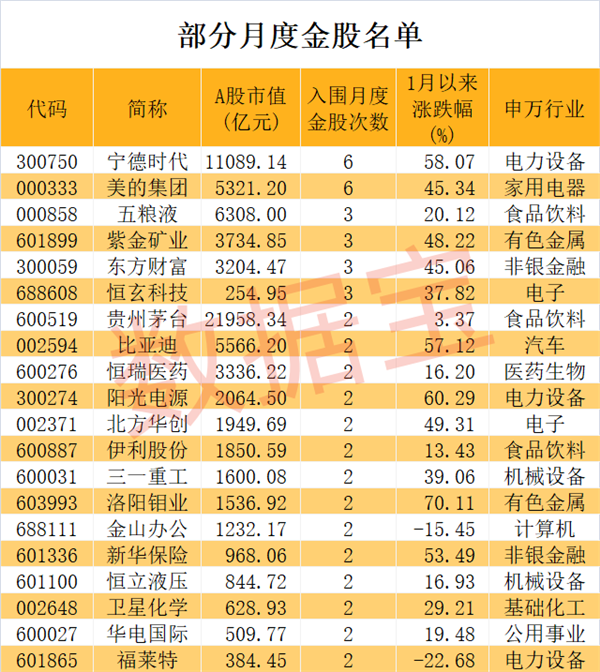 入围次数较多的还有东方财富、五粮液、紫金矿业、恒玄科技、三一重工等。