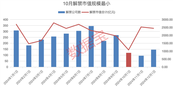 据证券时报数据宝统计,自2015年以来,解禁市值规模最大的月份为2021年6月,当月解禁市值高达9175.09亿元;最小解禁市值规模月份为2016年10月,当月解禁929.9亿元;今年10月1075.77亿元的解禁压力较小,仅高于2016年10月和7月两个月份的解禁规模。