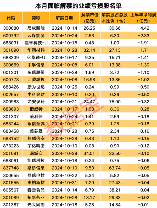 本月解禁股中,8只个股的上半年净利润亏损超亿元,易成新能、云煤能源、星环科技-U的上半年业绩亏损额居前,分别亏损4.42亿元、2.33亿元和1.91亿元。