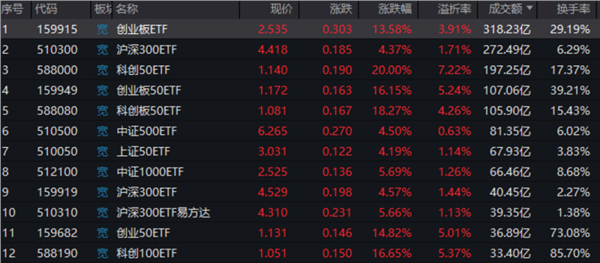 宽基ETF也在今日上午出现天量成交,易方达创业板ETF上午成交额超过318亿元,较前一个交易日放量超2倍;华泰柏瑞沪深300ETF成交272亿元,也超过前一个交易日全天的成交额。