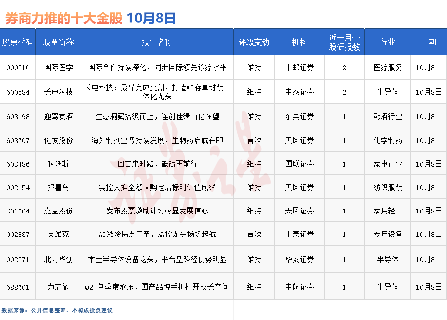 据证券之星数据库不完全统计,10月8日券商共给予10家A股上市公司买入评级。从行业分布看,券商10月8日关注的个股聚焦于医疗服务、半导体、化学制药、家电、纺织服装、家用轻工、专用设备等行业。