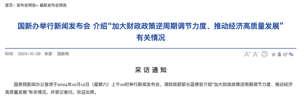 证券时报e公司讯,国务院新闻办公室将于10月12日上午10时举行新闻发布会,请财政部部长蓝佛安介绍“加大财政政策逆周期调节力度、推动经济高质量发展”有关情况,并答记者问。