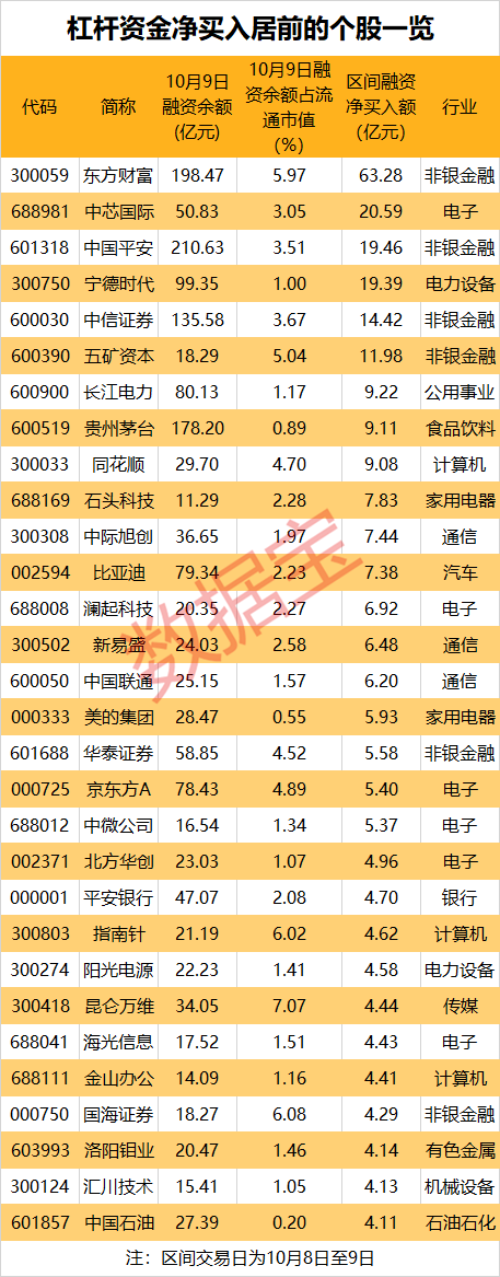 10月9日,东方财富、中信证券盘中股价创历史新高。当日,超900亿元资金扫货东方财富,其中融资资金单日净买入49.24亿元;中信证券成交额超420亿元,融资资金单日净买入15.52亿元。