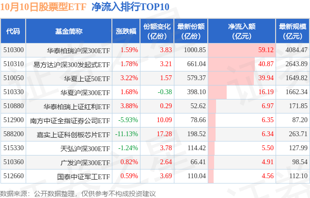 当日有351只股票型ETF基金出现资金净流入,其中净流入排首位的是华泰柏瑞沪深300ETF,份额增加了3.83亿份,净流入额为59.12亿元。