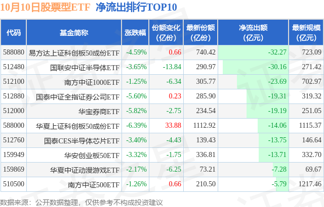 当日有315只股票型ETF基金出现资金净流出,其中净流出排首位的是易方达上证科创板50成份ETF,份额减少了6600.0万份,净流出额为32.27亿元。