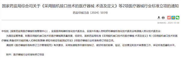 随后,脑机接口标准相继立项。就在10月8日,国家药监局发布通知,批准《采用脑机接口技术的医疗器械 术语及定义》和《采用脑机接口技术的医疗器械 具备闭环功能的植入式神经刺激器感知与响应性能测试方法》两项医疗器械行业标准制修订项目立项。
