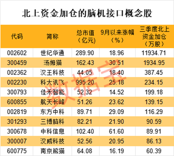 从最新公布的数据看,今年三季度,北上资金加仓的脑机接口概念股有世纪华通、汤姆猫、汉王科技、佳禾智能等,其中世纪华通获大幅加仓超1亿股。