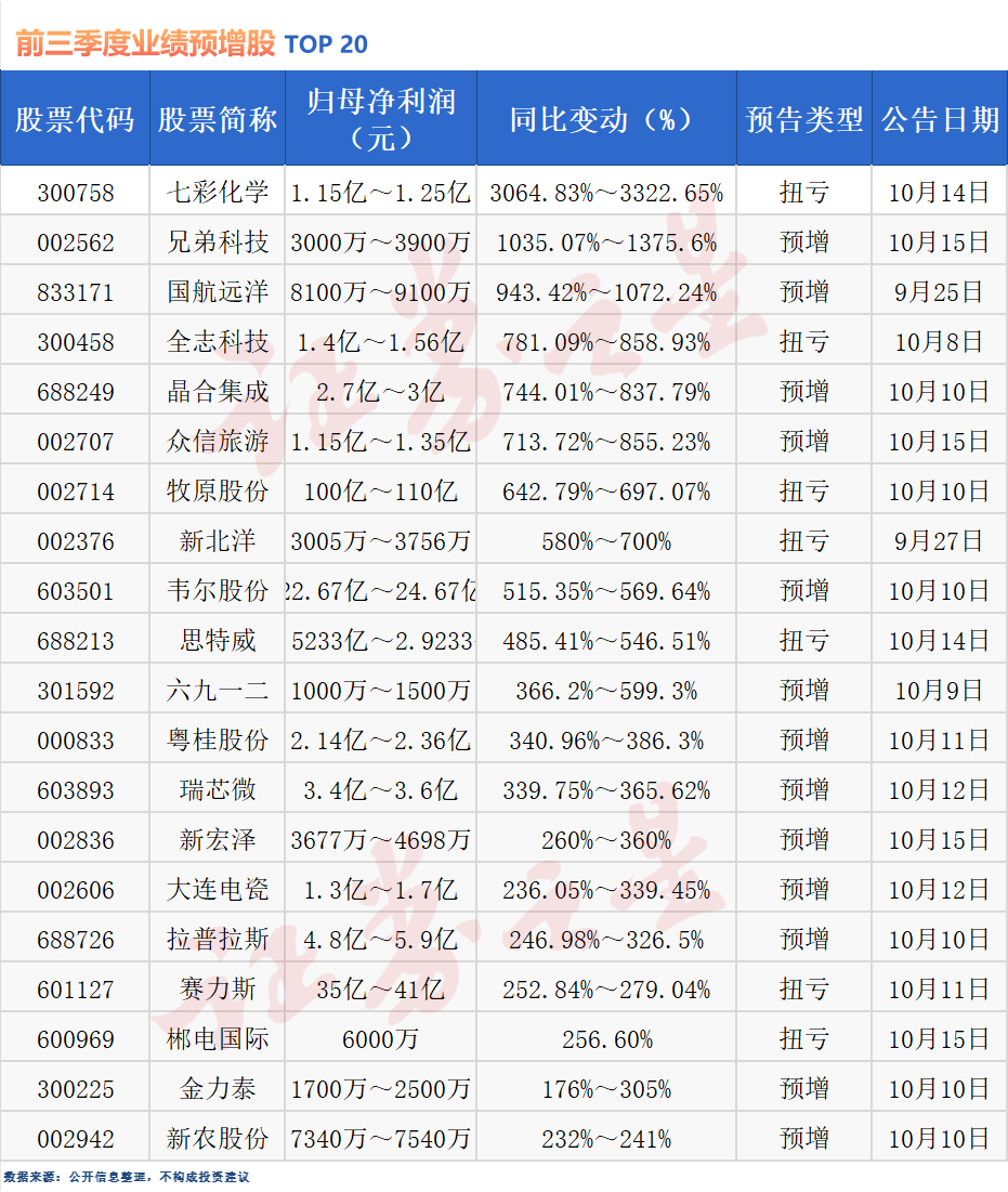 此外,还有全志科技、晶合集成、众信旅游、牧原股份、新北洋、韦尔股份、思特威、六九一二、粤桂股份、瑞芯微、新宏泽、大连电瓷、拉普拉斯等多股预计净利润增幅超3倍。