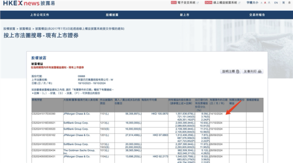 据港交所披露易信息显示,摩根大通于10月14日增持阿里巴巴-W约5636万股,平均价格为105.0870港元,涉资约59.22亿港元。增持后持股数目为15.51亿股,持股比例由7.80%增至8.09%。