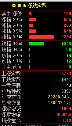 市场共3773只个股上涨,190只个股涨停,1441只个股下跌。