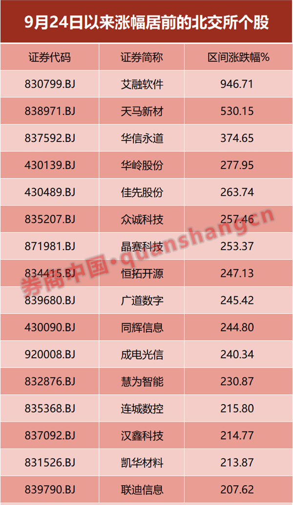 拉长时间来看,自9月24日启动反弹以来至今,北证50指数累计涨幅超过100%,仅用15个交易日就实现了翻倍。个股方面,在此期间内,艾融软件涨约947%,逼近十倍股,天马新材涨逾五倍,华信永道涨近375%,华岭股份、佳先股份、众诚科技等13只个股涨超两倍。