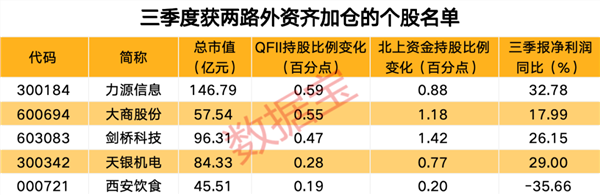 综合两路外资来看,第三季度中,获得北上资金和QFII共同加仓的股票有5只,分别是力源信息、大商股份、剑桥科技、天银机电、西安饮食,随着上市公司三季报的逐渐披露,这一数量有望持续增长。