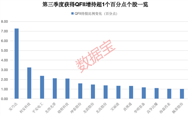 三季度获得QFII新进或增持的股中,山金国际、华明装备、中粮糖业、力源信息的QFII持股数量增长居前,均获得超600万股加仓。从持股比例变化来看,安乃达、利安科技、平安电工、龙图光罩、晓程科技的QFII持股占流通股比例在第三季度增长超2个百分点。