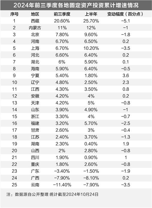截至10月24日,全国至少25个省份公布了前三季度经济运行情况,有10个省份的固定资产投资增速进一步加快。其中,辽宁同比增长4.8%,创2019年以来同期增速最好成绩,较上半年加快2.3个百分点;湖南同比增长2.3%,较上半年加快1.9个百分点;四川同比增长1.9%,较上半年加快1个百分点。