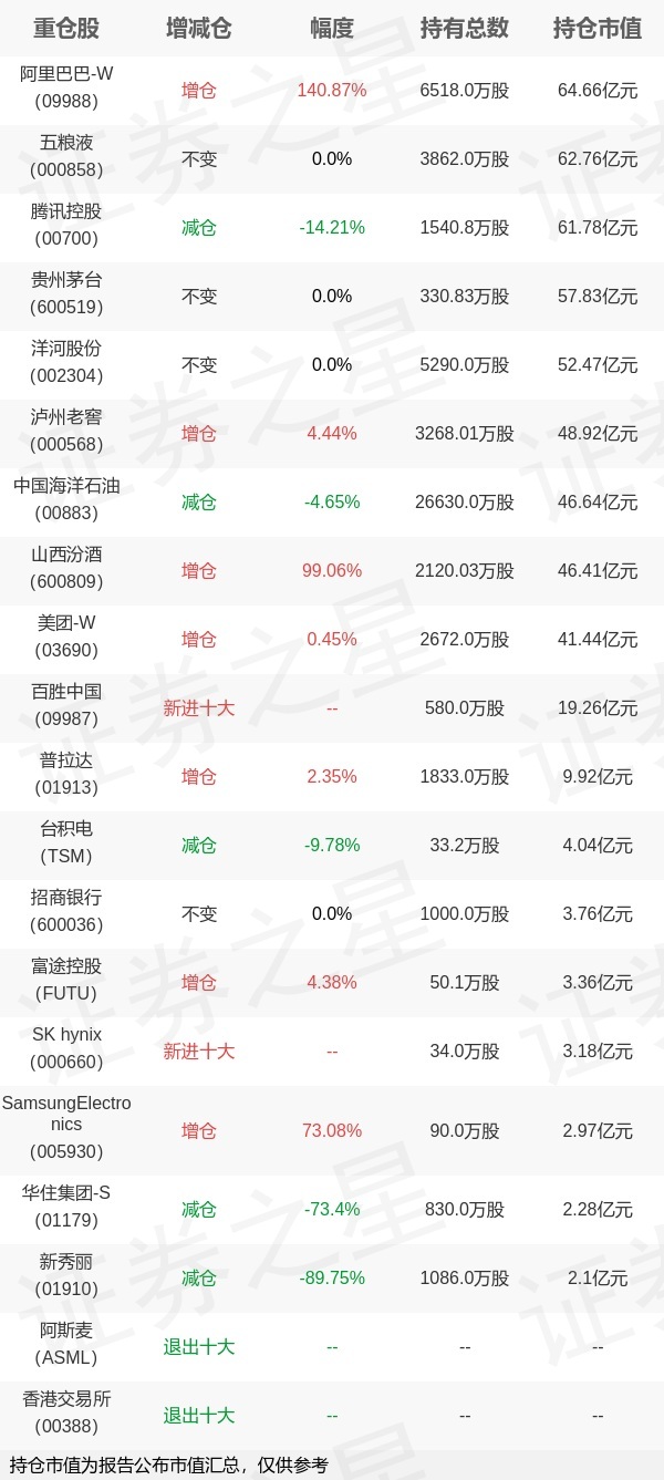 另外,白酒行业板块个股更受其关注,与上季度相比,泸州老窖、山西汾酒等被增持;大金融行业板块则遭到减持;目前其旗下基金综合持仓排名前三个股为阿里巴巴-W、五粮液、腾讯控股。