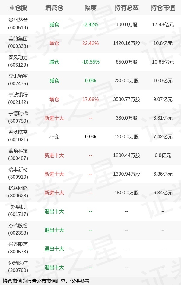 目前其旗下基金综合持仓排名前三个股为贵州茅台、美的集团、春风动力。
