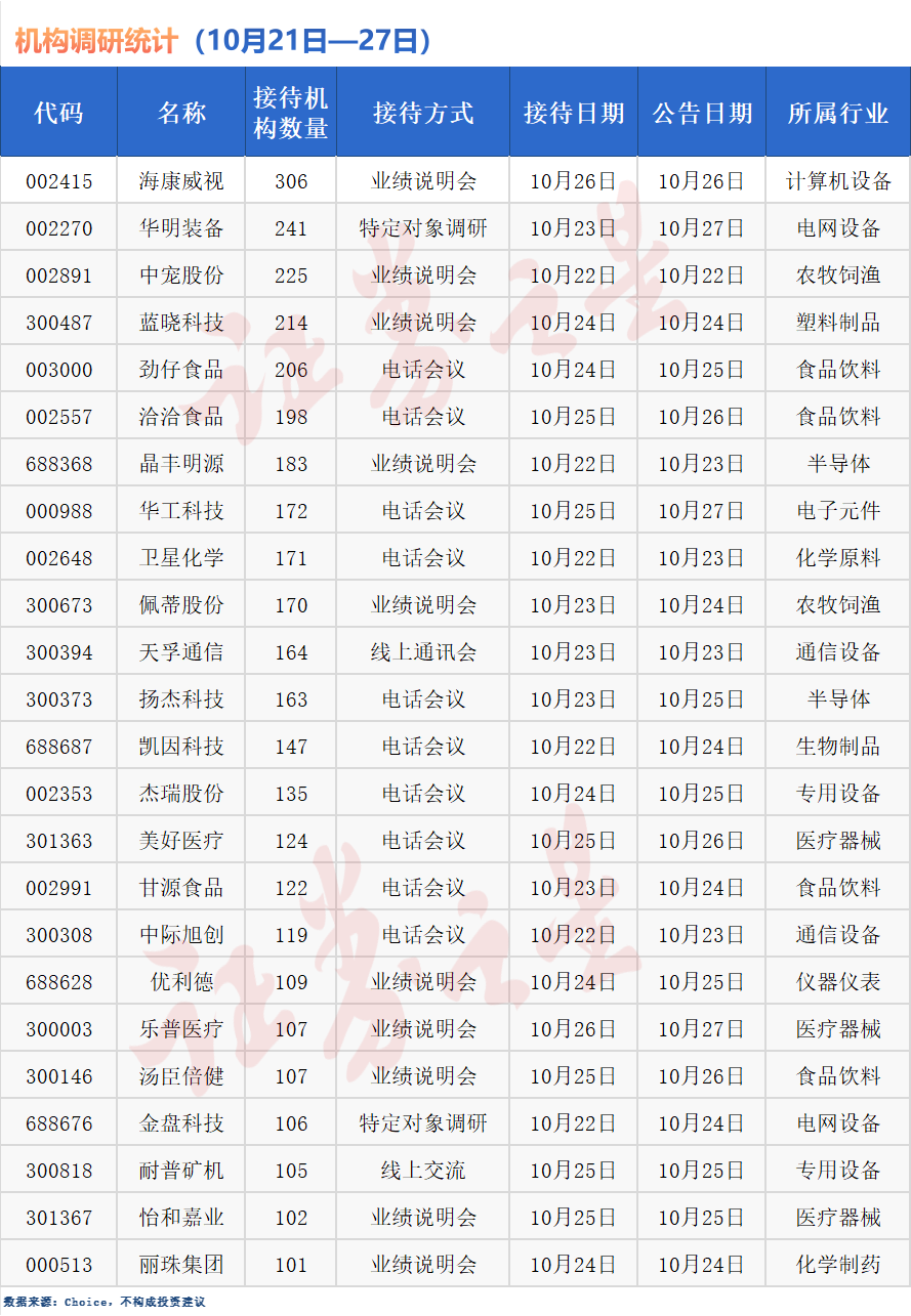 除了上述公司外,还有蓝晓科技、劲仔食品、洽洽食品、晶丰明源、华工科技、卫星化学、佩蒂股份、天孚通信、扬杰科技等多家公司备受机构关注,近期获百家以上机构调研。